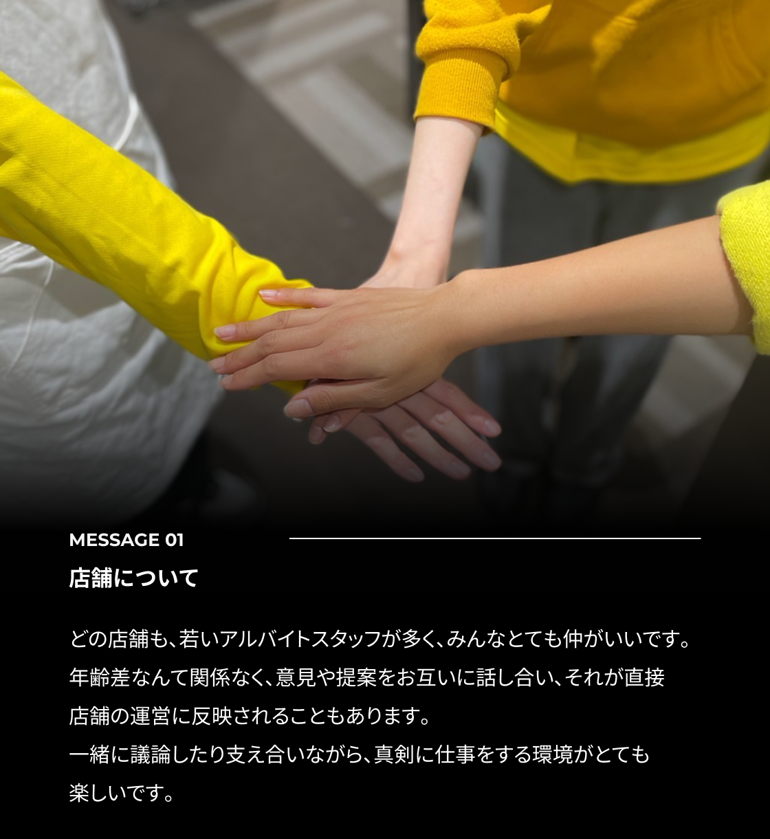 A:新店舗出店時などは忙しい時期もありますが、チームで協力し合いながら働く楽しさがあります。
