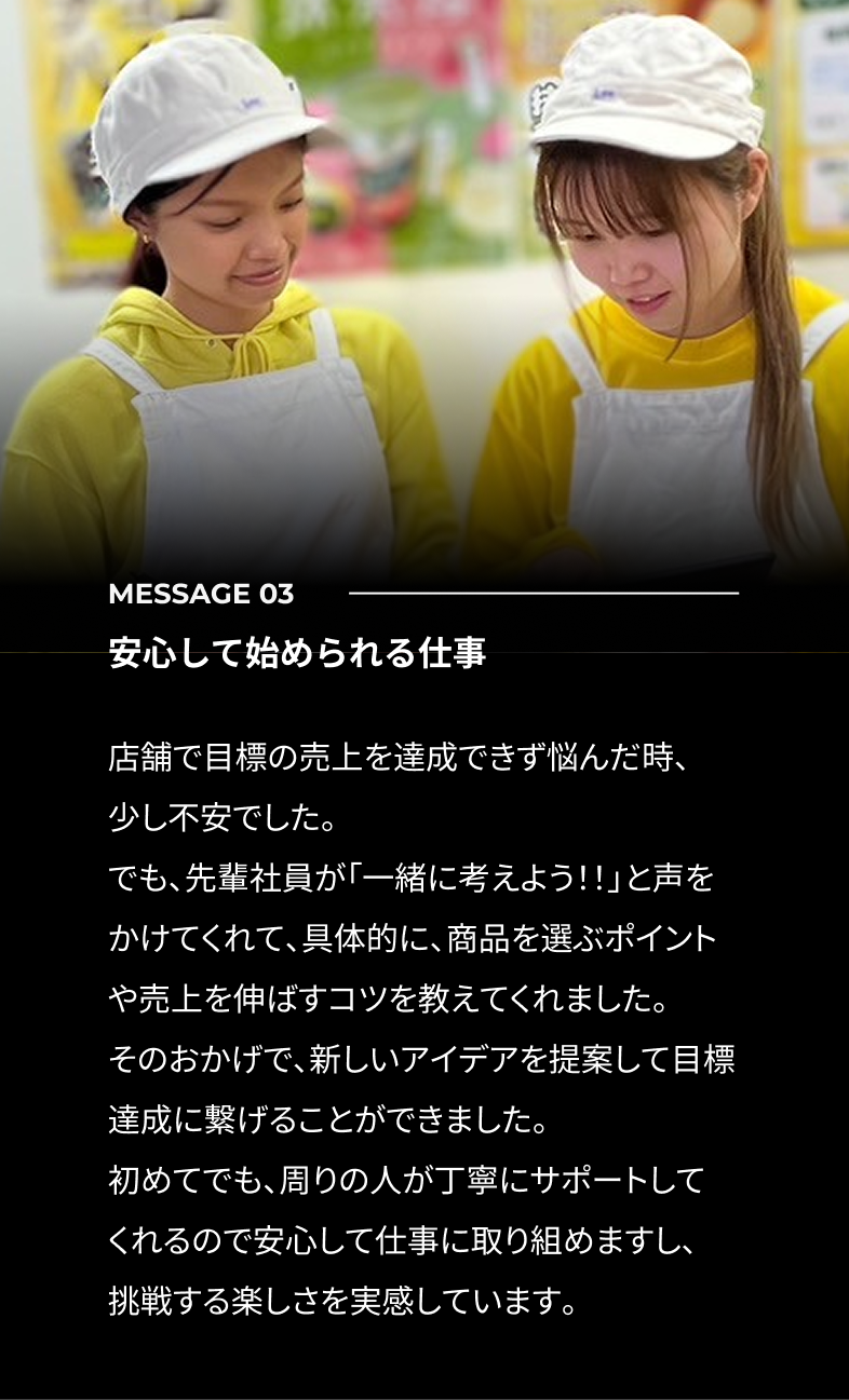 先輩が丁寧に教えてくれたおかげで今では楽しく働けています。