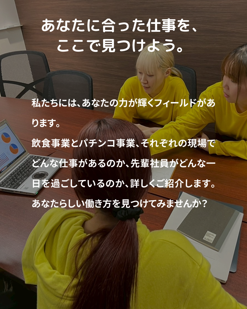飲食・物販事業部 ★村岡さん(入社7ヶ月) 1年目から新規出店や新商品開発に携わる事ができる会社です。 詳しく見る パチンコ事業部 ★若佐さん(入社3ヶ月) 楽しく成長できる会社です。 詳しく見る 飲食・物販事業部 ★村岡さん(入社7ヶ月) 1年目から新規出店や新商品開発に携わる事ができる会社です。 詳しく見る パチンコ事業部 ★若佐さん(入社3ヶ月) 楽しく成長できる会社です。 詳しく見る 詳しくはこちら 詳しくはこちら 高校生向け採用サイト TOP 先輩社員メッセージ 仕事内容・社員の一日 保護者の方へ お問い合わせ プライバシーポリシー TOP 先輩社員メッセージ 仕事内容・社員の一日 保護者の方へ お問い合わせ プライバシーポリシー 高校生向け採用サイト