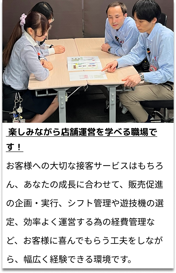 お客様に「また来たい!」と思ってもらえるお店を、一緒に作りましょう。 楽しみながら働ける環境がここにあります。仲間と一緒に成長しながら、お客様の笑顔に触れる仕事は、とてもやりがいがあります。あなた自身も成長できるお仕事を、ぜひ体験してみませんか? CONTACT 詳しくはこちら CONTACT 詳しくはこちら 高校生向け採用サイト TOP 先輩社員メッセージ 仕事内容・社員の一日 保護者の方へ お問い合わせ プライバシーポリシー TOP 先輩社員メッセージ 仕事内容・社員の一日 保護者の方へ お問い合わせ プライバシーポリシー 高校生向け採用サイト